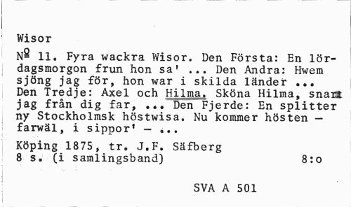 //// Wisor //// N§ 11. Fyra wackra Wisor. Den Första: En lördagsmorgon frun hon sa' ... Den Andra: Hwem sjöng jag för, hon war i skilda länder ... Den Tredje: Axel och Hilma. Sköna Hilma, snari jag från dig far, ... Den Fjerde: En splitter ny Stockholmsk höstwisa. Nu kommer hösten — farwäl, i sippor' - ... //// Köping 1875, tr. J.F. Säfberg 8 s. (i samlingsband) 8:o //// SVA A 501 ////