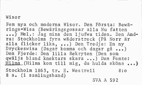 //// Wisor //// Fem nya och moderna Wisor, Den Första: Bewä-rings=Wisa (Bewäringsgossar alla Nu fatten ...) Mel.: Jag mins den liufwa tiden. Den Andra: Stockholms fyra wäderstreck (På Norr är alla flickor lika, .„.) Den Tredje: En ny Dryckeswisa (Dagar komma och dagar gå ..,) Den Fjerde: Den lilla Rekryten (Den som qwäljs bland knektars skara ...) Den Femte: Hilma ("Hilma kom till mig, du hulda sköna . //// Stockholm 1863, tr. E. Westrell 8:0 //// 8 s. (i samlingsband) //// SVA A 59 2 ////