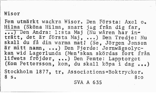 //// Wisor //// Fem utmärkt wackra Wisor. Den Första: Axel o® Hilma (Sköna Hilma, snart jag från dig far, ...J Den Andra: l:sta Maj (Nu wåren har inträtt, det är första Maj, ...) Den Tredje: Nu skall du få din warma matJ (Se, Jörgen Jensen är mitt namn, .*.) Den Fjerde: Jernwägsolyc-kan wid Lagerlunda (Menfskan skördas fort från lifwets fröjder, .,.) Den Femte: Lapptorget (Kom Pettersson, kom, du skall köpa i dag ...) //// Stockholm 1877, tr. Associations=Boktrycker. 8 s. 8:0 //// SVA A 635 ////