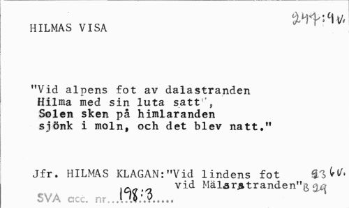 //// HILMAS VISA //// "Vid alpens fot av dalastranden Hilma med sin luta satt ', Solen sken på himlaranden sjönk i moln, och det blev natt." //// Jfr. HILMAS KLAGAN: "Vid lindens fot 9,111/. //// icxa.n vid Mälarstranden"g, 30 //// SVA ccc. nr. »TIO... ////
