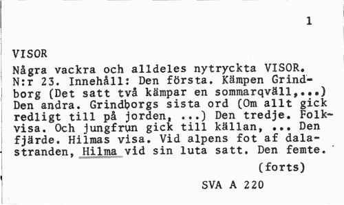 //// 1 //// VISOR //// Några vackra och alldeles nytryckta VISOR. N:r 23. Innehåll: Den första. Kämpen Grindborg (Det satt två kämpar en sommarqväll,.,.) Den andra. Grindborgs sista ord (Om allt gick redligt till på jorden, ...) Den tredje. Folkvisa. Och jungfrun gick till källan, ... Den fjärde. Hilmas visa. Vid alpens fot af dalastranden, Hilma vid sin luta satt. Den femte. //// (forts) //// SVA A 220 ////