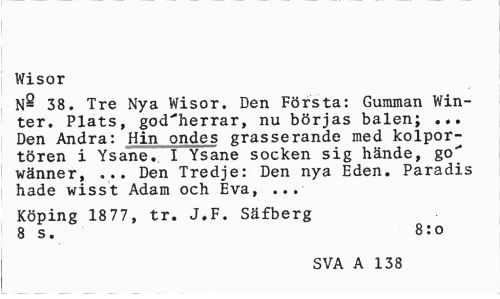 //// Wisor //// n8 38. Tre Nya Wisor. Den Första: Gumman Win-ter. Plats, godsherrar, nu börjas balen; ... Den Andra: Hin ondes grasserande med kolportören i Ysane. I Ysane socken sig hände, go> wänner, ... Den Tredje: Den nya Eden. Paradis hade wisst Adam och Eva, ... //// Köping 1877, tr. J.F. Säfberg 8 s. 8:o //// SVA A 138 ////