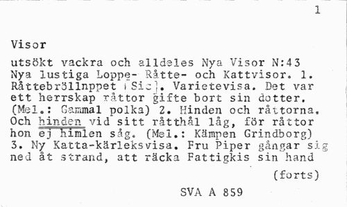 //// I //// Visor //// utsökt vackra och alldeles Nya Visor N:4 3 Nya lustiga Loppe- Råtte- och Kattvisor. 1. Råttebröllnppet iSie], Varietevisa. Det var ett herrskap råttor gifte bort sin dotter. (Mel.: Gammal polka) 2. Hinden och råttorna. Och hinden vid sitt råtthål låg, för råttor hon ej himlen såg. (Mel.: Kämpen Grindborg) 3. Ny Katta-kärleks visa. Fru Piper gångar sig nea åt strand, att räcka Fattigkis sin hand //// (forts) //// SVA A 859 ////