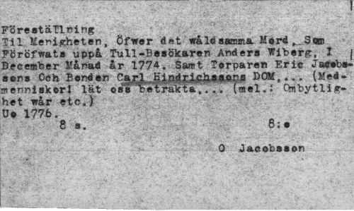 //// Föreställning ' , //// Til Menigheten, öfwer det wald samma. Mord Förcfwats uppå Tull-Besökaren Anders Wibsrg I December Månad år 1774. San-, t T or paren Eric Jjg** //// 8ens Och Bonden I?!*! //// menniskorl lät osTtoetrakta,... (mel.. Omtytiig- //// het *år etc.} //// Os 1776. o.. //// 8 s. 8'* //// 0 Jacobsson ////