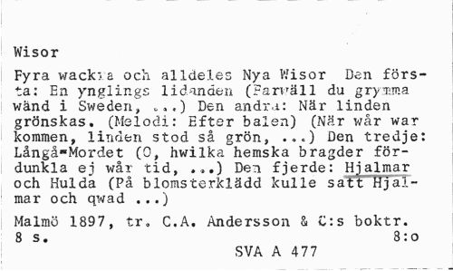 //// Wisor //// Fyra wack:-a och alldeles Nya Wisor Den första: En ynglings lidanden (Farväl1 du grymma wänd i Sweden, o..) Den andra: När linden grönskas. (Melodi: Efter balen) (När v/år war kommen, linden stod så grön, .<.«) Den tredje: Långå-Mordet (0, hwilka hemska bragder fördunkla ej wår tid, ,..) Den fjerde: Hjalmar och Hulda (På blomsterklädd kulle satt Hjalmar och qwad ...) //// Malmö 1897, tr» C.A. Andersson å C:s boktr. 8 s. 8:o //// SVA A 477 ////