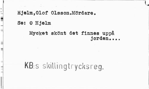 //// Vj //// - Hjelm,Olof Olsson.Mördare. //// Se: O Hjelm //// Mycket skönt det finnes uppå //// jorden... //// = KB:S skiliingtrycksreg. ////