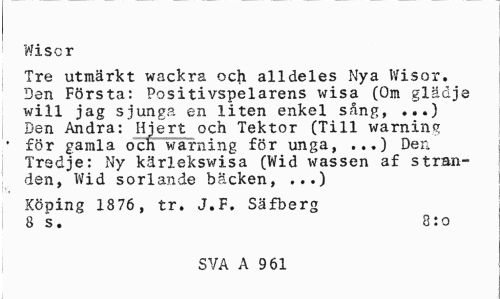 //// Wisor //// Tre utmärkt wackra och alldeles Nya Wisor. Den Första: Positivspelarens wisa (Om glädje will jag sjunga en liten enkel sång, ...) Den Andra:" Hiert och Tektor (Till warning ' för gamla ocn warning för unga, ...) Den Tredje: Ny käriekswisa (Wid wassen af stranden, Wid sorlande bäcken, ...) //// Köping 1876 , tr. J.F. Säfberg 8 s. 8:0 //// SVA A 9 61 ////