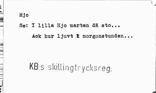 //// : hjo //// Set I lilla Hjo marten dä sto... //// Ack hur ljuvt t morgonstunden... //// ! KB:S skiltingtrycksreg: ////