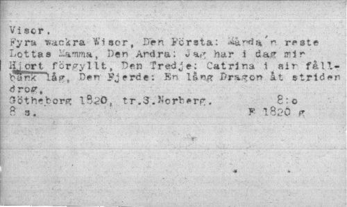 //// Visor. //// Fyra »ankra V»'i ser, Den Första: jååndu'" reste Lottas Mamma, Den Ard.ra: Ja^ har i dag irir El ort förgyllt. Den Tredje; Catrina ^sir fållrank låg, Den Fj erde: En lång Dragon åt striden drofi', //// 3'ötheborg 1820, tr.S.Korberr. 8:0 //// B 3. F 1820 f //// r... ¦ : . £ ////
