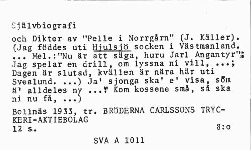 //// Självbiografi //// och Dikter av "Pelle i Norrgårn" (J. Kaller). (Jag föddes uti Hiulsiö socken i Västmanland. ... Mel.:"Nu är att säga, huru Jarl Ångantyr"£ Jag spelar en drill, om lyssna ni vill, Dagen är slutad, kvällen är nära här uti Svealund. Ja' sjonga ska' e1 visa, söm //// ä' alldeles nv ...V Kom kossene små, så ska ni nu få, ...) //// Bollnäs 19 33, tr» BRÖDERNA CARLSSONS TRYCKERI -AKTIEBOLAG //// 12 s. 8:0 //// SVA A 1011 ////