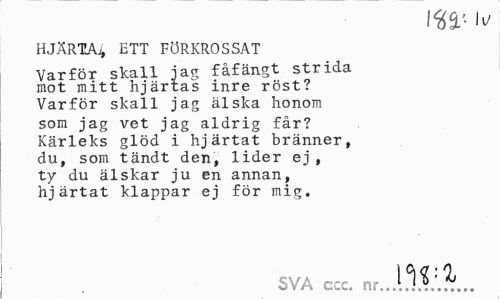 //// it/ //// HJÄRTA^ ETT FÖRKROSSAT //// Varför skall jag fåfängt strida mot mitt hjärtas inre röst? Varför skall jag älska honom som jag vet jag aldrig får? Kärleks glöd i hjärtat bränner, du, som tändt den, lider ej, ty du älskar ju en annan, hjärtat klappar ej för mig. //// SVA ccc. nr...11?:.^... ////
