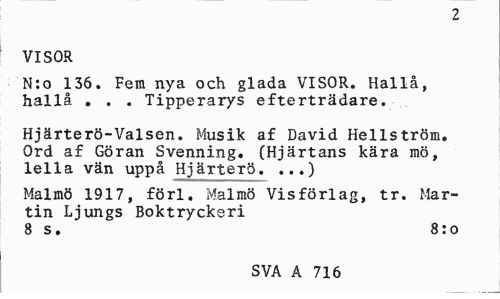//// 2 //// VISOR //// N:o 136. Fem nya och glada VISOR. Hallå, hallå . . . Tipperarys efterträdare. //// Hjärterö-Valsen. Musik af David Hellström. Ord af Göran Svenning. (Hjärtans kära mö, lella vän uppå Hjärterö. ...) //// Malmö 1917, förl. Malmö Visförlag, tr. Martin Ljungs Boktryckeri //// 8 s. 8:o //// SVA A 716 ////