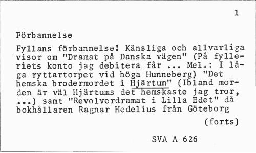 //// 1 //// Förbannelse //// Fyllans förbannelse! Känsliga och allvarliga visor om "Dramat på Danska vägen" (På fylleriets konto jag debitera får ... Mel.: I låga ryttartorpet vid höga Hunneberg) "Det hemska brodermordet i Hjärtum" (Ibland morden är väl Hjärtums det Tiemskäste jag tror, ...) samt "Revolverdramat i Lilla Edet" då bokhållaren Ragnar Hedelius från Göteborg //// (forts) //// SVA A 6 26 ////