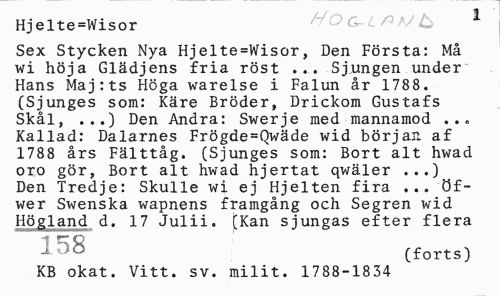 //// Hjelte=Wisor /' G- ~ C //// Sex Stycken Nya Hjelte=Wisor, Den Första: Må wi höja Glädjens fria röst ... Sjungen under Hans Maj:ts Höga warelse i Falun år 1788. (Sjunges som: Käre Bröder, Drickom Gustafs Skål, ...) Den Andra: Swerje med mannamod ... Kallad: Dalarnes Frögde=Qwäde wid början af 1788 års Fälttåg. (Sjunges som: Bort alt hwad oro gör, Bort alt hwad hjertat qwäler •••).. Den Tredje: Skulle wi ej Hjelten fira ... öf-wer Swenska wapnens framgång och Segren wid Högland d. 17 Julii. (Kan sjungas efter flera //// - (forts) //// KB okat. Vitt. sv. milit. 1788-1834 ////