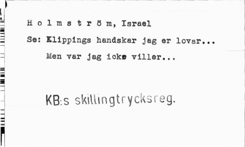 //// f //// y Holmström, Israel //// z Se: Klippings handskar jag er lovar... = Men var jag icke viller... //// i //// -j KB.s skillingtrycksreg. i n ////