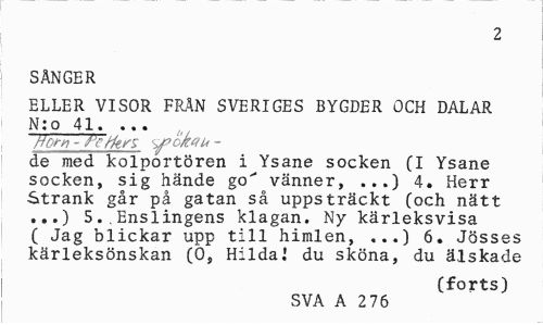//// 2 //// SÅNGER //// ELLER VISOR FRÅN SVERIGES BYGDER OCH DALAR N:o 41. ... //// fifim - fetfers sfo/wu - //// de med kolportören i Ysane socken (I Ysane socken, sig hände go" vänner, ...) 4, Herr Strank går på gatan så uppsträckt (och nätt ...) 5..Enslingens klagan. Ny kärleksvisa ( Jag blickar upp till himlen, ...) 6. Jösses kärleksönskan (0, Hilda.1 du sköna, du älskade //// (forts) //// SVA A 2 76 ////