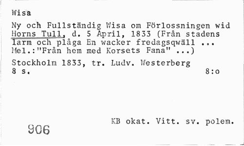 //// Wisa //// Ny och Fullständig Wisa om Förlossningen wid Horns Tull, d. 5 April, 1833 (Från stadens larm och plåga En wacker fredagsqwäll ... Hel.:"Från hem med Korsets Fana" ...) //// Stockholm 1833, tr. Ludv. Westerberg 8 s. 8 :o //// KB okat. Vitt. sv. polem. //// 806 ////