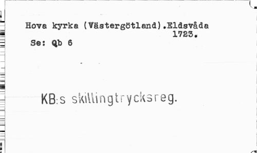 //// VJ //// Hova kyrka (Västergötland).Eldsvåda I 1725. //// | Se: Qb 6 //// = KB.s skillingtrycksreg. ////