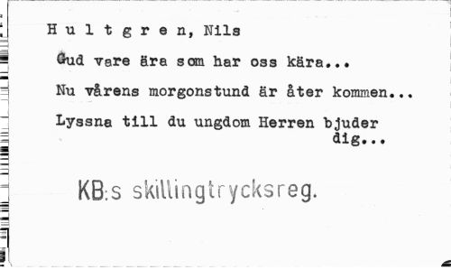 //// Hultgren, Nils //// 1 Gud vare ära san har oss kära... //// 3 Nu vårens morgonstund är åter kommen... //// Lyssna till du ungdom Herren bjuder | dig... //// 1 KB:S skiUingtrycksreg. //// i //// 3 ////