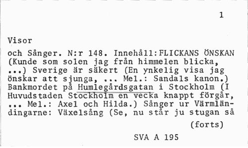 //// 1 //// Visor //// och Sånger. N:r 148. Innehåll:FLICKANS ÖNSKAN (Kunde som solen jag från himmelen blicka, ...) Sverige är säkert (En ynkelig visa jag önskar att sjunga, ... Mel.: Sandals kanon.) Bankmordet på. Humlegårds gatan i Stockholm (I Huvudstaden Stockholm en vecka knappt förgår, ... Mel.: Axel och Hilda.) Sånger ur Värmlän-dingarne: Växelsång (Se, nu står ju stugan så //// (forts) //// SVA A 195 ////