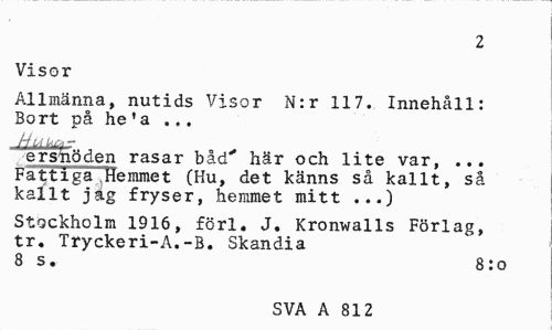 //// 2 //// Visor //// Allmänna, nutids Visor N:r 117. Innehåll: Bort på he'a ... //// ^Vrsnöden rasar båd" här och lite var, ... Fattiga Hemmet (Hu, det känns så kallt, så kallt jäg fryser, hemmet mitt ...) //// Stockholm 1916, förl. J. Kronwalls Förlag, tr. Tryckeri-A.-B. Skandia //// 8 s. 8: o //// SVA A 812 ////