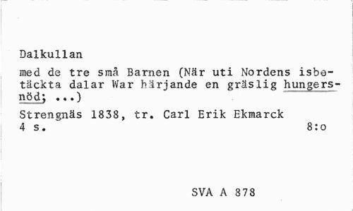//// Dalkullan //// med de tre små Barnen (När uti Nordens isbe-täckta dalar War härjande en gräslig hungersnöd; ...) //// Strengnäs 1838, tr. Carl Erik Ekmarck 4 s. 8:0 //// SVA A 8 78 ////