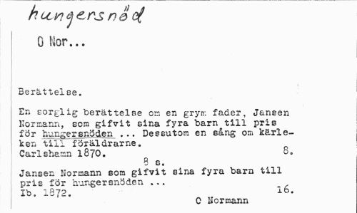 //// h oun ej ers n 0 c( O Nor... //// I //// Berättelse. //// En sorglig berättelse on en gryn: fader, Janeen Kornann, som gifvit sina fyra barn till pris för hungersnöden ... Dessutom en sång om kärleken till förälörarne. //// Carlehesm 1870. 8. //// 8 g. //// Jansen Hormann som gifvit sina fyra barn till //// pris för hungersnöden — //// Ib. 1872. l6- //// O Hormann ////