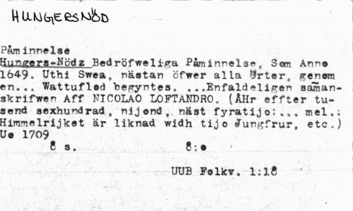 //// Påm innelse //// fr ra-Nöd 2 Bedröfweli-ga Påminnel3« „ Som Anno L649, Uthi Swea» nästan cfwer alla 9rter, genom sn... Wattuflod berryntea„ .. .Enfaldeli/?en saman-skrifwen Aff NICOLAO LOFTANDRO. (ÅHr effter tu-»end sexhundrad » ni j ond,, näst fyratijo;,.. mel.; ilmmelrijket är liknad widh tijo sTun^frur,, etc.) Jo 1709 //// 8 s. 8: o ' //// UUB Folkv. 1:18 ////