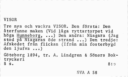 //// VISOR //// Tre nya och vackra VISOR. Den första: Den återfunne maken (Vid låga ryttartorpet vid höga Hunneberg, ...) Den andra: Niagara (Jag stod på Niagaras öde strand ...) Den tredje: Afskedet från flickan (Ifrån min fosterbygd den 1jufva ...) //// Göteborg 1894, tr. A. Lindgren & Söners Boktryckeri //// 8 s. 8 : o //// SVA A 58 ////