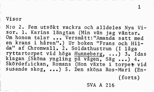 //// 1 //// Visor //// N:o 2. Fem utsökt vackra och alldeles Nya Visor. 1. Karins längtan (Min vän jag väntar. Om honom talar ... Versmått:"Amanda satt med en krans i håren"») Ur boken "Frans och Hilda" af Chronwall. 2. Soldathustrun (I låga ryttartorpet vid höga Hunneberg, ...) 3. Idas klagan .(Sköna yngling på vågen, Säg ...) 4. Skördeflickan, Romans (Hon växte i torped vid susande skog, .,.) 5. Den sköna Ros-Mari (En- //// (forts) //// SVA A 216 ////