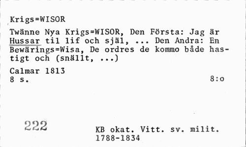 //// Krigs-WISOR //// Twänne Nya Krigs=WISOR, Den Första: Jag är Hussar til lif och själ, ... Den Andra: En Bewärings=Wisa, De ordres de komrao både hastigt och (snällt, ...) //// Calmar 1813 //// 8 s. 8:0 //// KB okat. Vitt. sv. milit. 1788-1834 ////