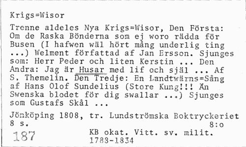 //// Krigs=Wisor //// Trenne aldeles Nya Krigs-Wisor, Den Första: Om de Raska Bönderna som ej woro rädda för Busen (I hafwen wäl hört mång underlig ting ...) Welment författad af Jan Ersson. Sjunges som: Herr Peder och liten Kerstin ... Den Andra: Jag är Husar med lif och själ ... Af S, Themelin. Den Tredje: En Land-twärns=Sång af Hans Olof Sundelius (Store Kung!Il Än Swenska blodet för dig swallar ...) Sjunges som Gustafs Skål ... //// Jönköping 1808, tr. Lundströmska Boktryckeriet 8 s. 8:0 //// -1 qm KB okat. Vitt. sv. milit. //// lö' 1788-1834 ////