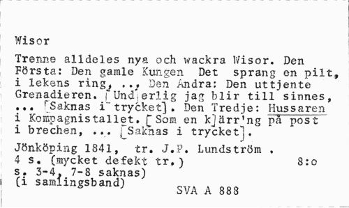 //// Wisor //// Trenne alldeles nya och w ack ra V/is or. Den Första: Den gamle Kungen Det sprang en pilt, i lekens ring^ ... Den Andra: Den uttjente Grenadieren. i Und'erlig jag blir till sinnes, ... [Saknas i" trycket] Den Tredje: Hussaren i Kompagnistallet. £ Som en kjärr'ng på post i brechen, ... fSaknas i trycketj. //// Jönköping 1841, tr. J.F. Lundström . 4 s. (mycket defekt tr,) 8:0 //// s. 3-4. 7-8 saknas) (i samlingsband) $yA A 8g8 ////