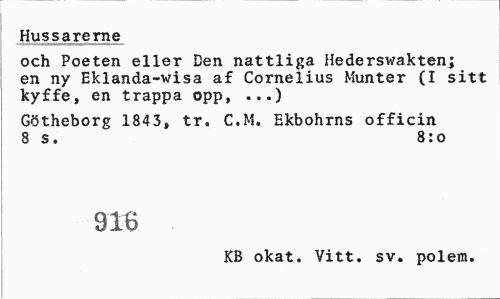 //// Hussarerne //// och Poeten eller Den nattliga Hederswakten; en ny Eklanda-wisa af Cornelius Munter (I sitt kyffe, en trappa opp, ...) //// Götheborg 1843, tr, C.M. Ekbohrns officin 8 s. 8:0 //// 916 //// KB okat. Vitt. sv. polem. ////