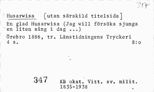 //// svr //// Husarwisa [utan särskild titelsida] //// En glad Husarwisa (Jag will försöka sjunga en liten sång i dag ...) //// Örebro 1886, tr. Länstidningens Tryckeri 4 s, 8:0 //// 347 KB okat. Vitt. sv. milit. //// 1835-1938 ////