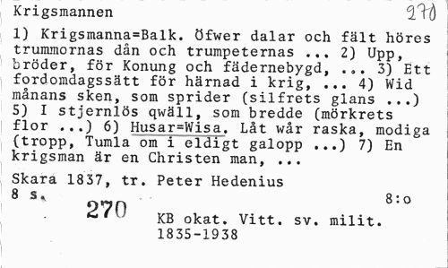 //// Krigsmannen 2 fö //// 1) Krigsmanna=Balk. öfwer dalar och fält höres trummornas dån och trumpeternas ... 2) Upp, bröder, för Konung och fädernebygd, ... 3) Ett fordomdagssätt för härnad i krig, ... 4) Wid månans sken, som sprider (silfrets glans ...) 5) I stjernlös qwäll, som bredde (mörkrets flor ...) 6) Husar=Wisa. Låt wår raska, modiga (tropp, Tumla om i eldigt galopp ...) 7) En krigsman är en Christen man, ... //// Skara 1837, tr. Peter Hedenius 8 s % 8: o //// ' KB okat. Vitt. sv. milit. 1835-1938 ////