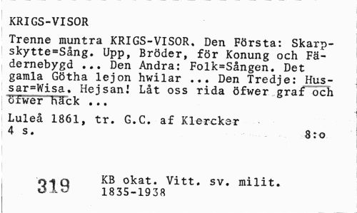 //// KRIGS-VISOR //// Trenne muntra KRIGS-VISOR. Den Första: Skarp-skytte=Sång. Upp, Bröder, för Konung och Fädernebygd ... Den Andra: Folk=Sången. Det gamla Götha lejon hwilar ... Den Tredje: Hus-sar=Wisa. HejsanJ Låt oss rida öfwer graf och ötwer häck ... //// Luleå 1861, tr. G.C. af Klercker 4 s. 8:0 //// 01 q KB okat. Vitt. sv. milit. Ol" 1835-1938 ////