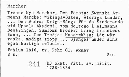 //// Marcher //// Trenne Nya Marcher, Den Första: Swenska Armeens Marche: Wikinga=Säten, Åldriga Lundar, ... Den Andra: Krigs=Sång: För de Studerande v/id Upsala Akademi, som deltogo i Allmänna Bewäringen. Samloms Bröder.' kring frihetens fana, ... Den Tredje: Husar=Wisa: Låt wår raska, modiga tropp ... Sjunges under sina egna hurtiga melodier. //// Fahlun 1816, tr. Pehr 01. Axmar 8 s . 8 : o //// 3/1 | KB okat. Vitt. sv. milit. 1788-1834 ////