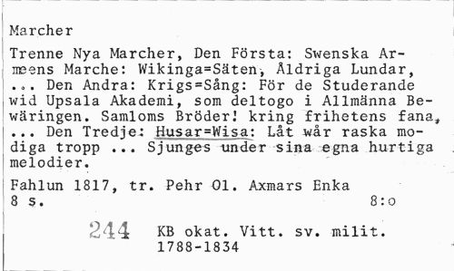 //// Marcher //// Trenne Nya Marcher, Den Första: Swenska Ar-ireens Marche: Wikinga=Säten, Åldriga Lundar, .,. Den Andra: Krigs=Sång: För de Studerande wid Upsala Akademi, som deltogo i Allmänna Be-wäringen. Samloms Bröder.' kring frihetens fana, ... Den Tredjes Husar=Wisa: Låt wår raska modiga tropp ... Sjunges under sina egna hurtiga melodier. //// Fahlun 1817, tr. Pehr 01. Axmars Enka 8 s. 8:o //// 244 KB okat. Vitt. sv. milit. //// 1788-1834 ////