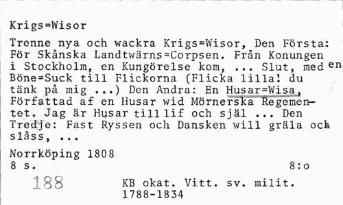 //// Krigs=Wisor //// Trenne nya och wackra Krigs=Wisor, Den Första: För Skånska Landtwärns=Corpsen. Från Konungen i Stockholm, en Kungörelse kom, ... Slut, med en Böne=Suck till Flickorna (Flicka lilla! du tänk på mig ...) Den Andra: En Husar=Wisa, Författad af en Husar wid Mörnerska Regementet. Jag är Husar tilllif och själ ... Den Tredje: Fast Ryssen och Dansken wi11 gräla och slåss, ... //// Norrköping 1808 //// 8 s. 8 : o //// 1§8 KB okat. Vitt. sv. milit. //// 1788-1834 ////