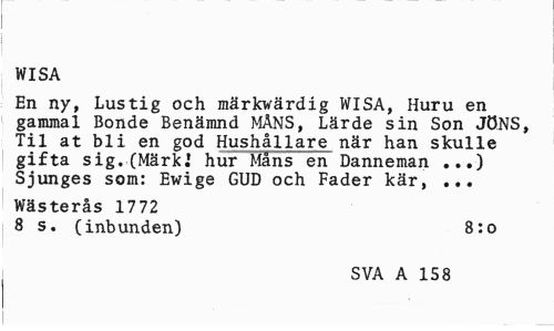 //// WISA //// En ny, Lustig och märkvärdig WISA, Huru en gammal Bonde Benämnd MÄNS, Lärde sin Son JÖNS, Til at bli en god Hushållare när han skulle gifta sig.(MärkJ hur Måns en Danneman ...) Sjunges som: Ewige GUD och Fader kär, ... //// Wästerås 1772 //// 8 s. (inbunden) 8:0 //// SVA A 158 ////