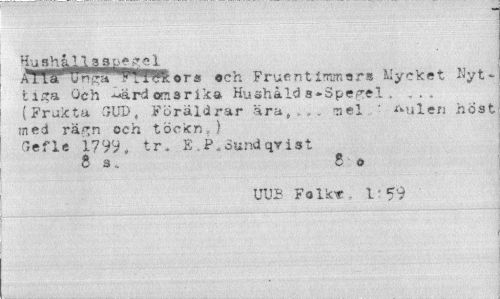//// Aftäf^n1"» V^WItor» «ch Fruentimmers Mycket Nyttiga Och **ärd oms rika Hushålds-Spegel, (Frakta GUD, Föräldrar ära,, . nel ' ^uleri höst med rägn och töckn.. ) (lefle 1799, tr. E.P.Sundqrist //// ta. 5 o //// UUE Folk* l' 59 ////