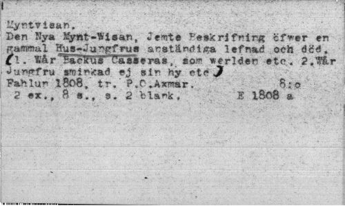 //// llyv.tvion. n. //// Den Nya Mynt-^ioan, Jemte B«»3crJ f>ir,g cf^er en gammal Rua-Ju^rfrue anständiga lefnad och dcé. Cl. liår ''fjaeiru* bal»eras, som werlden etc. 2 ."får Jur>ffru ej Bin hy etc Jf //// Fahlur l8ö8, tr." P.O.Åxmar, o //// 2 ex., B «., a. 2 E lSö8 a ////