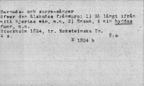 //// Saknads- och 3orge-sarger //// öfwer d«r älskades frånvaro: 1) Så långt ifrån nitt hj er tas wän, m.*n. 2) Sr sam, i -nir. hyddas //// *» " 7. //// famn, m .m. //// Stockholm 1824, tr. Ecksteinska Tr. 4. s . 8: o //// K 1824 h ////