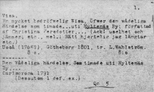 //// " - •. V. ; ; //// VIaa„ i //// F:r> mycket tedrcfwelig Wisa, Cfwer der? vmdeliga « Härd el se som tiwade, ..uti' By; författad //// af Christina Persdotter,... (AckTuselhet och fiffla??; etc., mel .; Rätt hj ér,fc elifr ja/et längtar etc.) • - //// Uooå (176-7), Oc-theborr l801, tr. L.Wahlström. //// 8 «. f \ ; \ ¦ //// Der Tådeliga händelse, 3e« t iirtad c uti Hyltenäs //// ¦ ' ¦' " / % ' , ' : Carlscrona 1791 //// (Dessutom 1 def. ex.) ////