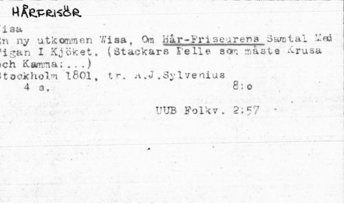 //// MAtePfeisfcft. //// i aa //// n ny utkommen Wisa, Om Hår-Frisearena Samtal Msi igan I Kjöket. (Stackars Fe Lie son måste Krusa ch Kamma; . . .} //// tockholm 1801, tr. a.J.Sylvenius //// 4s. 8:0 //// UUB Folkv. 2; 57 • ////