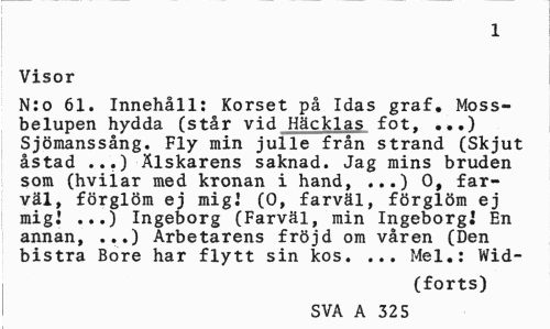 //// 1 //// Visor //// N:o 61. Innehåll: Korset på Idas graf. Mossbelupen hydda (står vid Häcklas fot, ...) Sjömanssång. Fly min julle från strand (Skjut åstad ...) Älskarens saknad. Jag mins bruden som (hvilar med kronan i hand, ...) O, farväl, förglöm ej migJ (0, farväl, förglöm ej migi ...) Ingeborg (Farväl, min IngeborgJ En annan, ...) Arbetarens fröjd om våren (Den bistra Bore har flytt sin kos. ... Mel.: Wid- //// (forts) //// SVA A 325 ////