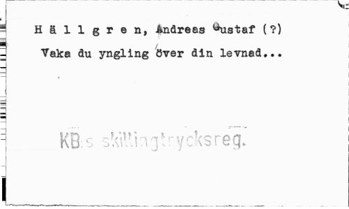 //// "'HL. //// I Hällgren, Andreas ^ustaf (?) //// j Vaka du yngling över din levnad... //// - //// 1 KB.s sMUingtrycksreg. i___ ////