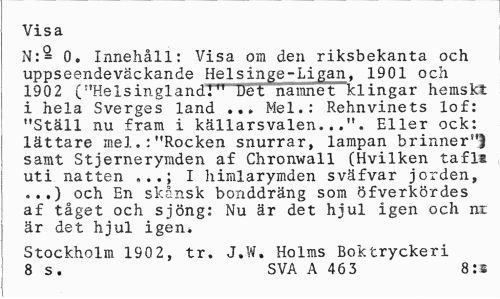//// Visa //// N:= 0. Innehåll: Visa om den riksbekanta och uppseendeväckande Helsinge-Ligan, 1901 och 1902 ("HelsinglandT" Det namnet klingar hemskt i hela Sverges land ... Mel.: Rehnvinets lof: "Ställ nu fram i källarsvalen...". Eller ock: lättare mel.:"Rocken snurrar, lampan brinner"! samt Stjernerymden af Chronwall (Hvilken tafla uti natten I himlarymden sväfvar jorden, //// ...) och En skånsk bonddräng som öfverkördes af tåget och sjöng: Nu är det hjul igen och ni är det hjul igen. //// Stockholm 1902, tr. J.W. Holms Boktryckeri 8 s. SVA A 46 3 8:5 ////