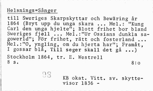 //// Helsnings=Sånger //// till Sweriges Skarpskyttar och Bewäring år 1864 (Bryt upp du unga skara ... Mel.: "Kung Carl den unga hjelte"; Blott frihet bor bland Sweriges fjell ... Mel.:"Ur Ossians dunkla sa-gowerld"; För frihet, rätt och fosterland ... Mel.:"0, yngling, om du hjerta har"; Framåt, I gossar blå, Till seger skall det gå ...) //// Stockholm 1864, tr. E. Westrell 8 s. 8:o //// no //// KB okat. Vitt. sv. skyttevisor 1836 - ////
